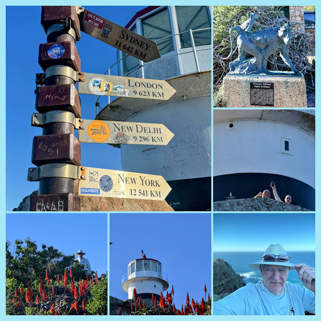 After frolicking with the penguins, we headed to the Cape of Good Hope Lighthouse. The discovery of the cape opened the first all-water route from Europe to Asia. The first recorded sighting was in 1488 by Portuguese explorer Bartolomeu Diaz. Check out the sculpture of the monkeys - they are all over this park and can be quite mischievous and also can be disturbing. We looked for them but only saw their "poop" as indicators that they were around. We took a tram to the mid-point, I walked maybe halfway up to the lighthouse, Mickey and others in our group made it to the top.